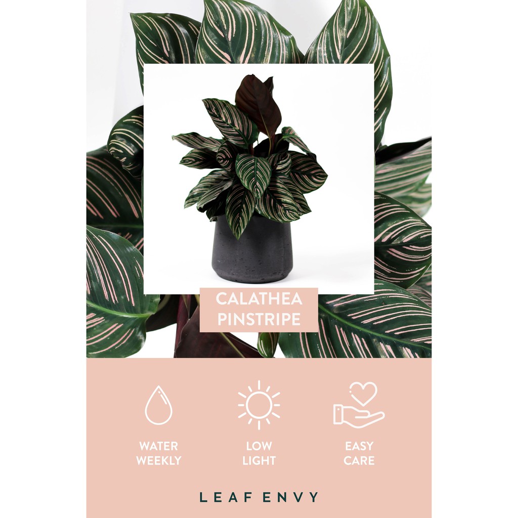 Calathea pinstripe has to be one of Mother Natures finest creations It literally looks like each dark green leave was delicately painted with thin pink lines These glossy leaves do a wonderful job of airpurifying and just making you smile LIGHT Bright but indirect light WATER AND SOIL. Calathea Care Guide Light No direct sunlight for Calathea's otherwise you will lose the markings On the other hand very dark spots need to be given a miss as well A North facing windowsill would be the first choice here, but any other situation will be acceptable providing you can provide shielding from the direct sunlight these places would receive at some point during the day For example. Calathea Filter Filter Best selling Sort by Sort by $10$1000 4" Calathea Lancifolia Rattlesnake Plant $1500 4" Calathea Orbifolia $1500 4" Calathea Ornata Pinstripe $10 4" Calathea Zebrina $10 4" Calathea Fusion White $1750 4" Calathea Medallion $10 4" Calathea Beauty Star $10 4" Calathea Makoyana $10.