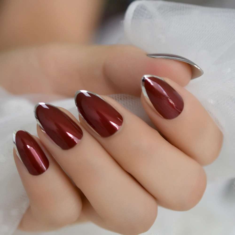 Burgund Nail Art Metallic Silber Franzosisch Stilettos Falsche Nagel Oval Sharp Bordeaux Rot Presse Auf Gefalschte Nagel Freies Klebeband Falsche Nagel Aliexpress