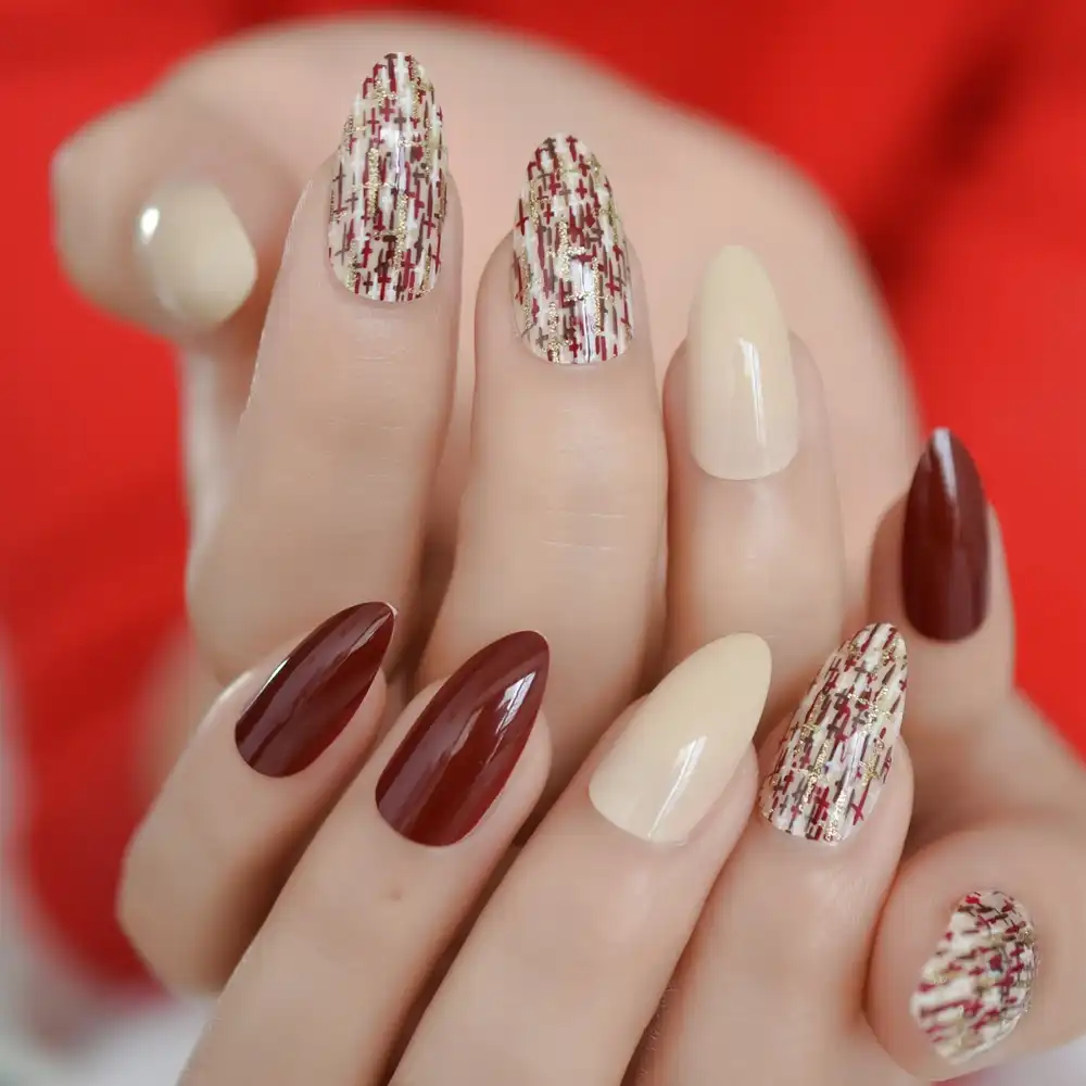 Bordeaux Rot Medium Wies Mandel Voller Nagel Kreuz Designs Glitter Nagel Stiletto Falsche Acryl Manikure Nagel Tipps Falsche Nagel Aliexpress