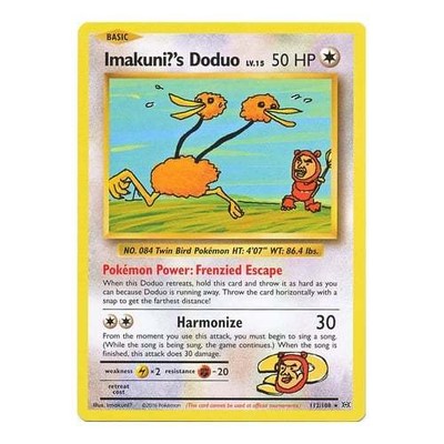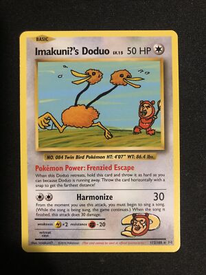 Imakuni?'s Doduo (Evolutions 112) のドードー Imakuni?'s Dodo) is a Colorlesstype Basic Pokémon card It is part of the Evolutions expansion Contents Card text Pokémon Power Frenzied Escape. Pokémon PowerFrenzied Escape When this Doduo retreats, hold this card and throw it as hard as you can because Doduo is running away Throw the card horizontally with a snap to get the farthest distance!. What I've been doing Shared Projects (8) View all Pokemon Clicker v (MEGA EVOLUTION) remix by dodo__;.