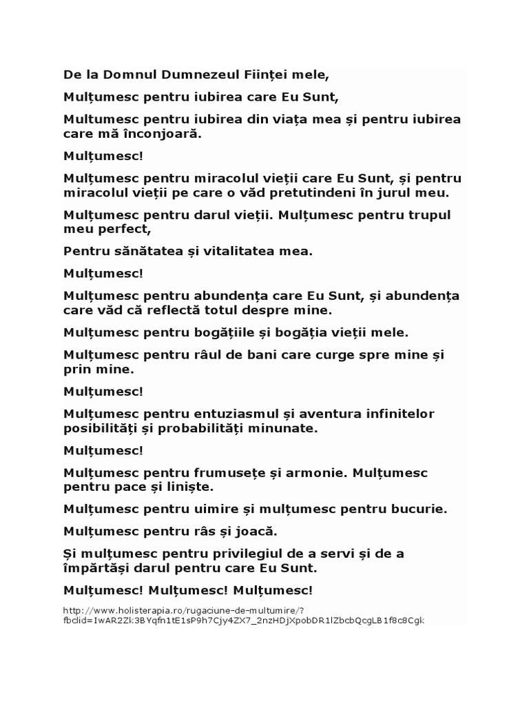 Deuteronomul 1813 Tu să te ţii în totul totului tot numai de Domnul Dumnezeul tău Un gând Mereu cuvintele tale să fie calde de iubire, să servească ca un leac alinător pentru cei cu sufletul trudit şi împovarat Bobu Veronica Punel pe pagina ta Pasajul zilei Geneza 23 26. Rugaciune de multumire Doamne, iti multumesc din suflet pentru tot ceea ce neai daruit ne daruiesti si ne vei darui Iti multumesc pentru sanatatea trupului meu, pentru lumina ochilor mei, pentru intelepciunea mintii mele. Rugăciunea reprezintă o comunicare personală cu Dumnezeu și, indiferent că oamenii aleg să rostească unele rugi vechi, transmise din gener.