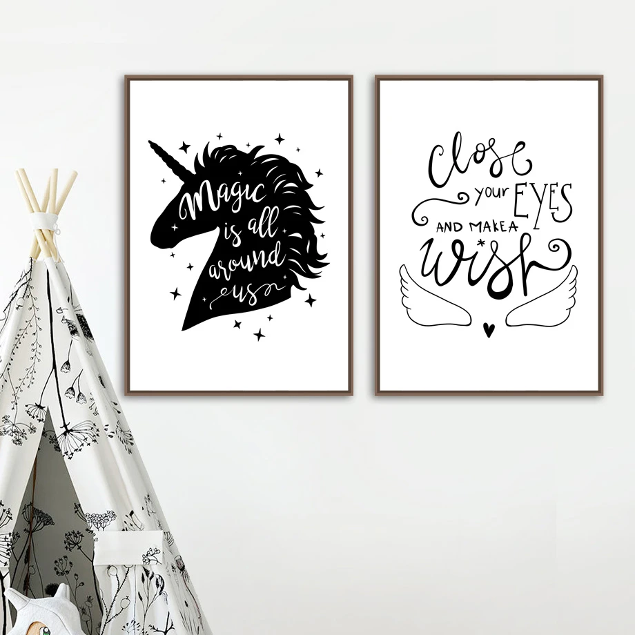 Magie Einhorn Zitate Wand Kunst Leinwand Malerei Schwarz Weiss Poster Und Drucke Cartoon Leinwand Kunst Nordic Stil Kinder Schlafzimmer Dekor Malerei Und Kalligraphie Aliexpress