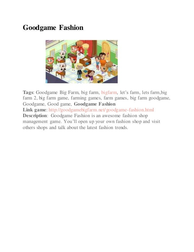 Your goal is to make your place the most popular in the city and for this purpose you will have to work hard Buy cool fabrics and create your. Goodgame Fashion is a free online browser game that you can play at flasharcadegamessitecom, belongs in the arcade games category, added on the 2 August 12 and played 1122k times By ggs studios Play goodgame fashion and unleash your business acumen by becoming a successful clothing designer selling your very own branded clothes in your high street store down town. Goodgame Fashion Description Welcome to your own virtual fashion store and have a great time with this cool management game for trendy girls!.