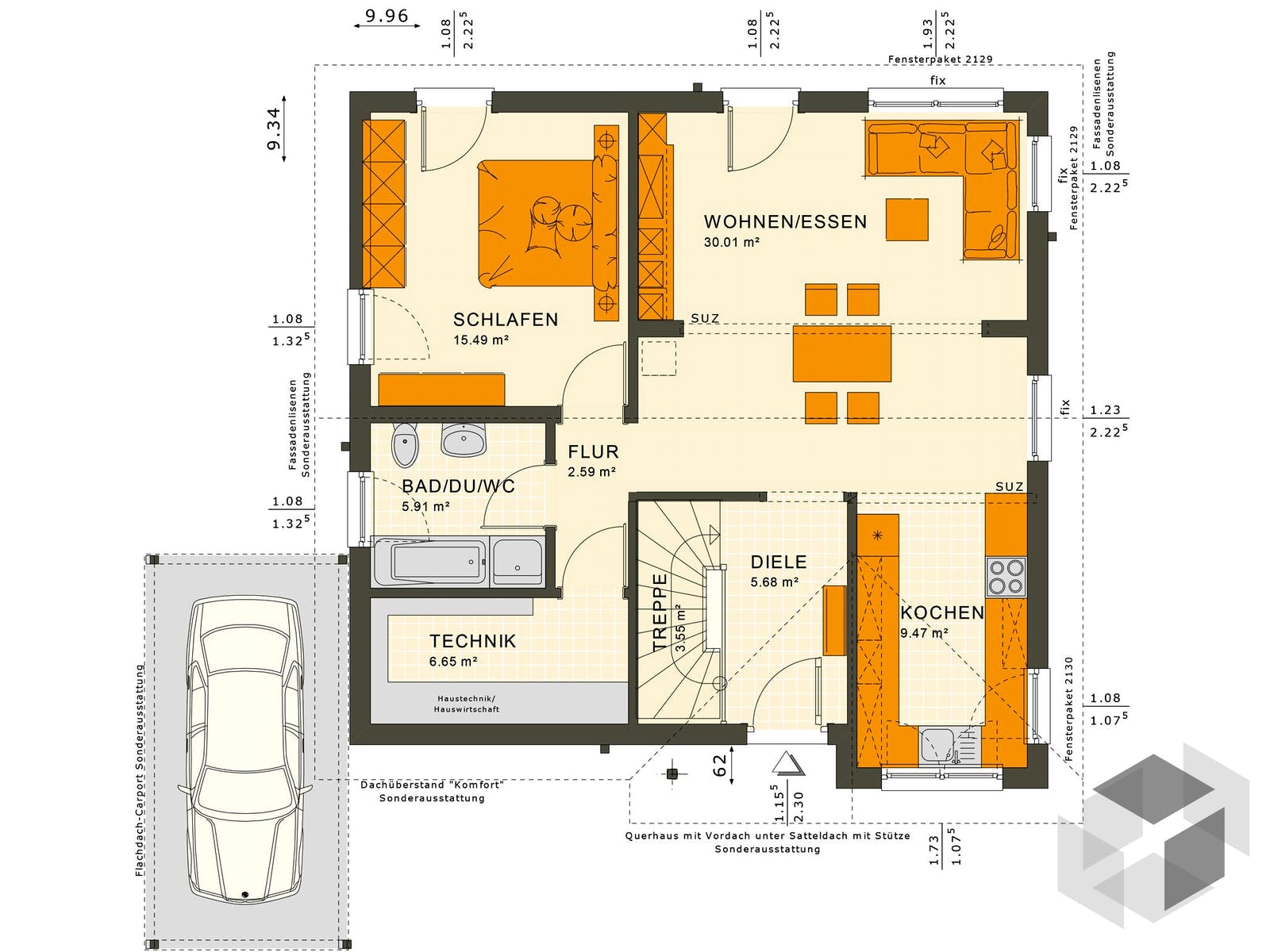 Grundriss Bungalow Mit Satteldach Erdgeschoss Modern Kuche Offen Carport 2 Zimmer Mit Keller Fertighaus S Haus Grundriss Living Haus Grundriss Bungalow