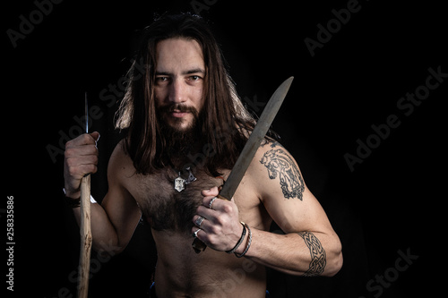 Strong Bearded Long Haired Man With A Tattoo On His Shoulder Holding A Knife And A Spear Of The Viking Era And Smiling Buy This Stock Photo And Explore Similar Images