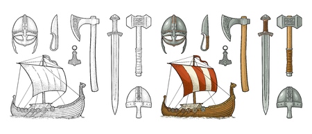 Set Viking Knife Drakkar Axe Helmet Sword Hammer Thor Amulet With Runes Vintage Vector Black Engraving Illustration Isolated On White Background Hand Drawn Design Element For Poster Label Tattoo Graphic Vector