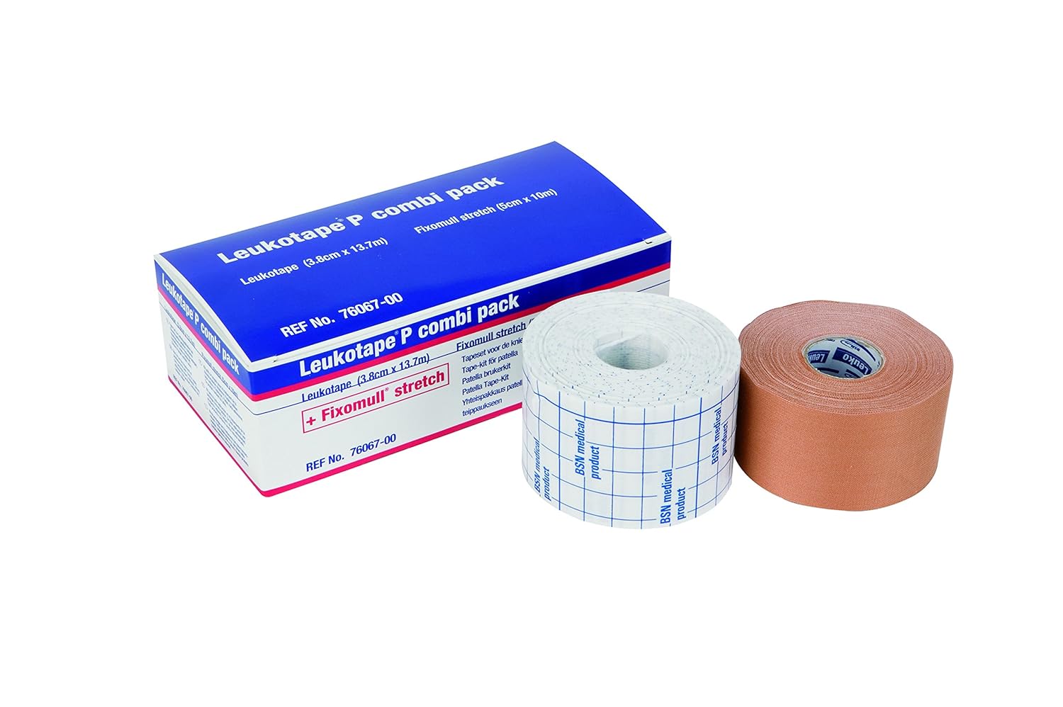 Leukotape P Combi Pack Kombinationssatz Von 3 8 Cm X 13 7 M Leukotape Und 5cm X 10m Fixomull Stretch Tape Patella Taping Set Fur Knie Stabilitat Und Support Knieband Fur Femoropatellaren Amazon De Gewerbe Industrie
