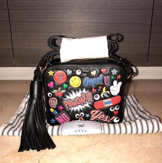 This item is the only one of its kind and there is just one piece available The Rope Bow bag is the ultimate chic day bag with a soft, foldable construction This mini version has the same construction as the tophandle, but can be worn cross body with the detachable strap The rope bow hardware is a new interpretation of our bow logo and adds a luxurious finish Item number. Anya hindmarch all over stickers black crossbody bag with tags & dust bag!. A colorful array of stickerstyle graphics lends quirky charm to this translucent vinyl Anya Hindmarch tote The substantial silhouette is styled with a reinforced base and rolled leather handles Attached zip pocket Slim tie closures at open top Dust bag included Fabric Vinyl Weight 42oz / 119kg Made in Italy Measurements Height 11.