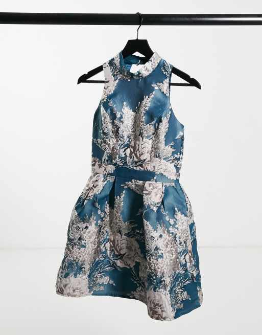 Chi Chi London Hojhalset Galla Minikjole I Petroleumsbla Jacquard Med Blomstermonster Evesham Nj