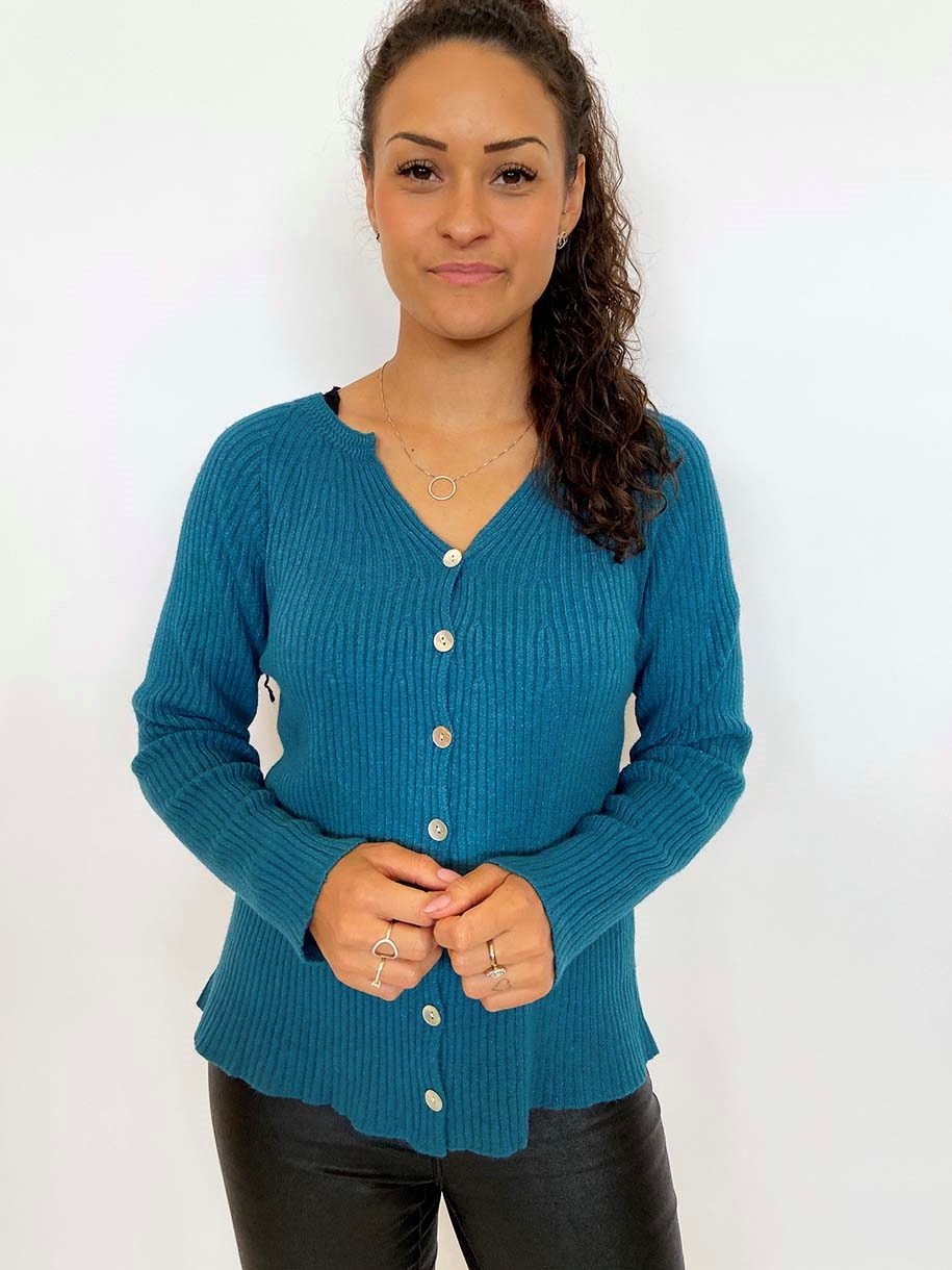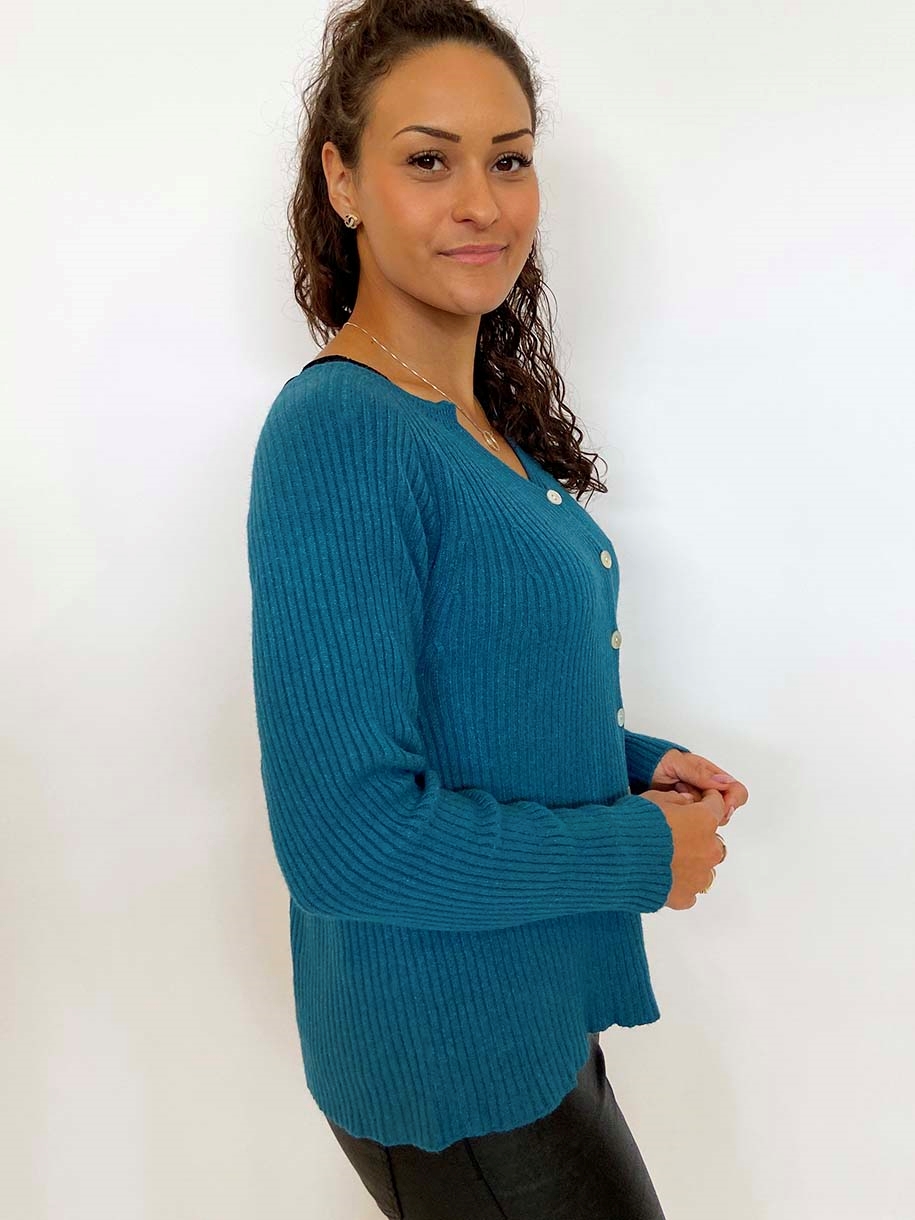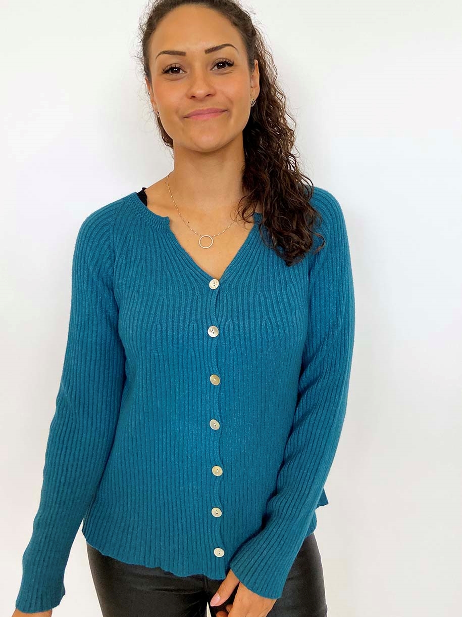 Viola Midi Petroleumsbla Cardigan Med Guldknap I Halsen