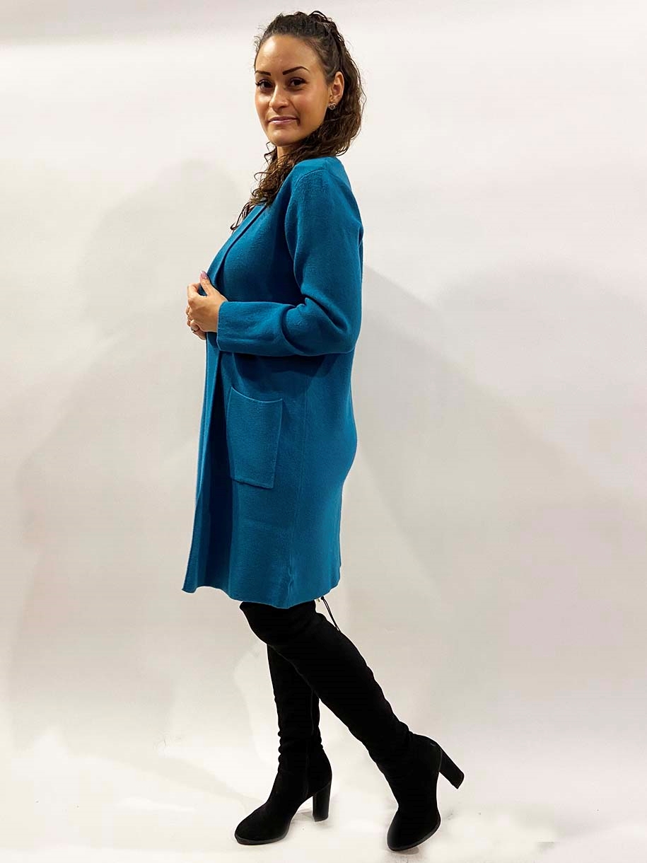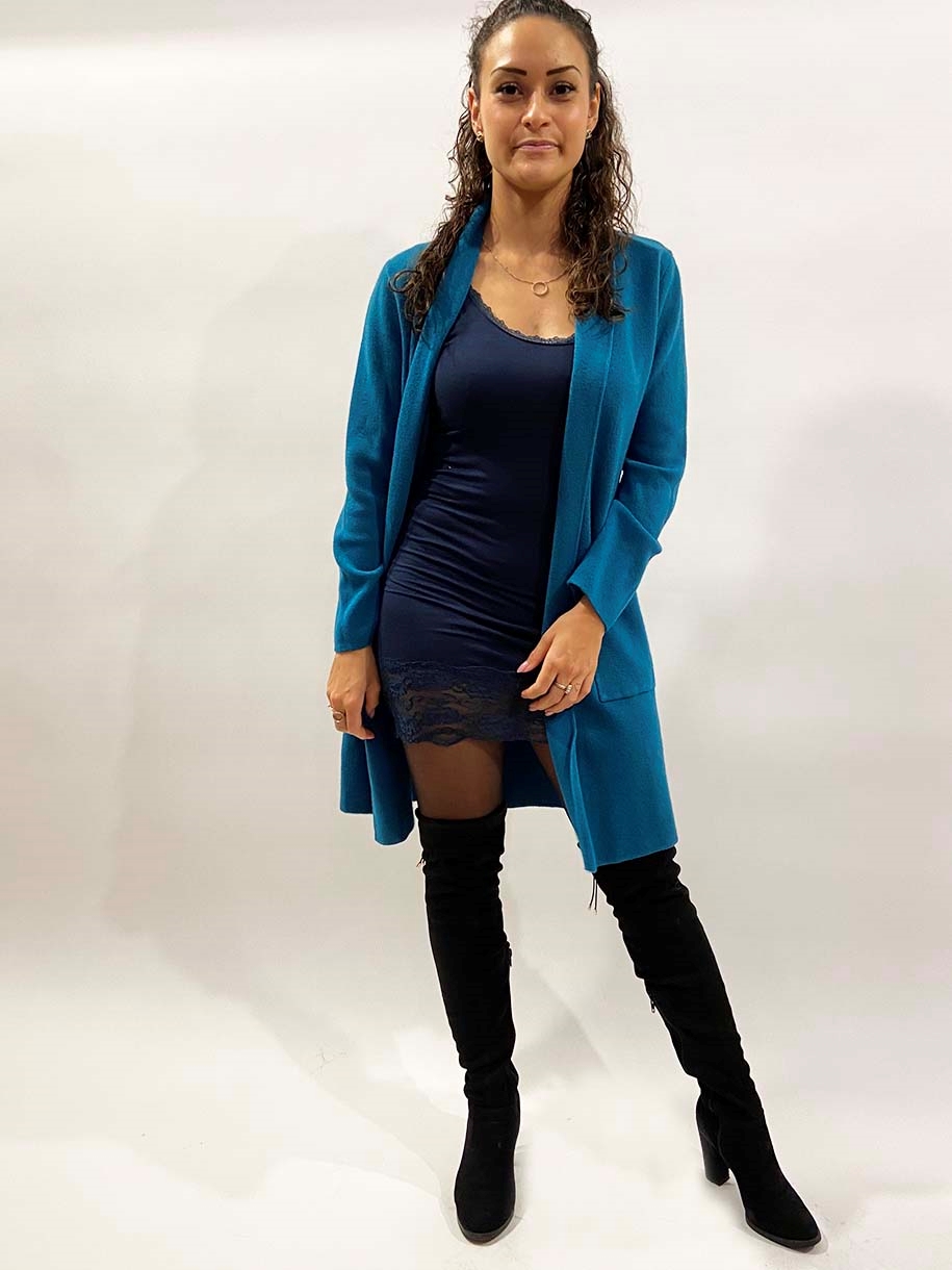 Viola Long Petroleumsbla Cardigan Med Guldknap I Halsen