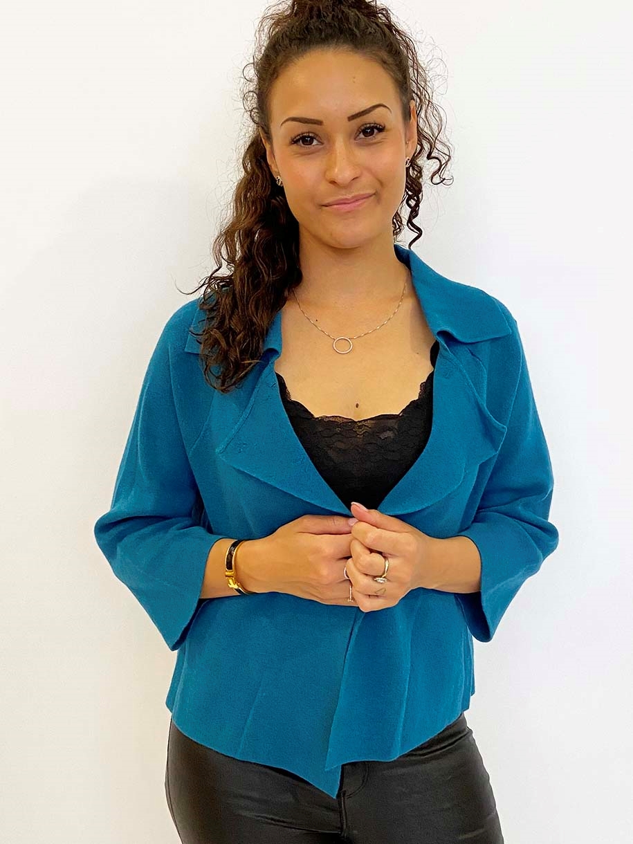 Viola Short Petroleumsbla Cardigan Med Guldknapp Vid Halsen