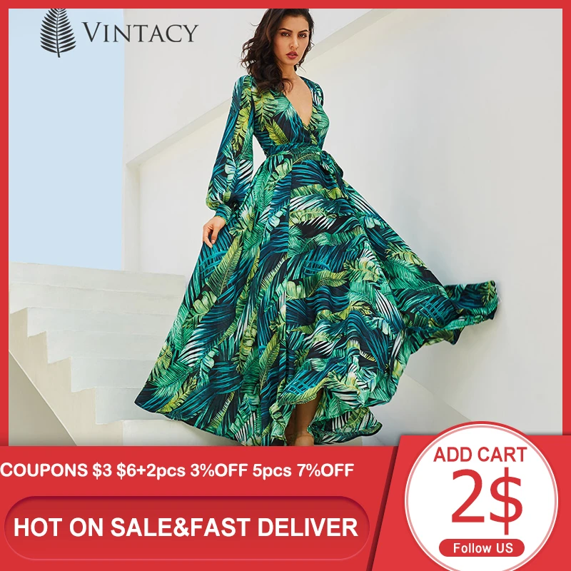 Vintacy Langarm Kleid Grun Tropical Strand Vintage Maxi Kleider Boho Casual V Ausschnitt Gurtel Spitze Up Tunika Drapierte Plus Grosse Kleid Plus Size Dress Sleeve Dressvintage Maxi Dress Aliexpress