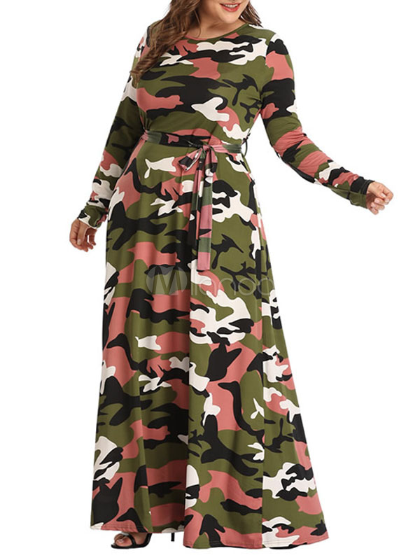 Damen Maxikleider Plus Size Langarm Jewel Neck Camo Print Lace Up Long Dress Milanoo Com