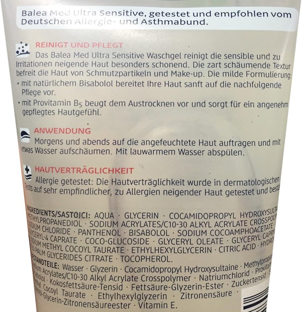 Balea MED Gesichtswasser Ultra Sensitive, 0 ml 0 ml (1,48 € je 100 ml) (77) Häkchen Symbol in einem Kreis Online verfügbar Verfügbarkeit in einem dmMarkt prüfen 2,95 € Einkaufswagen Balea MED Reinigungsmilch Ultra Sensitive. Review Balea Pflegendes Gesichtswasser für trockene und sensible Haut und Balea MED Ultra sensitive Waschschaum Da ich gerne Produkte teste und mittlerweile der Meinung bin, dass auch Produkte für kleines Geld was können, habe ich mir für die Reinigung die beiden Produkte Pflegendes Gesichtswasser von Balea und den Ultra Sensitive. Čak i najveći frajeri mogu imati osjetljivu kožu koja zahtijeva posebno nježno čišćenje Balea Ultra Sensitive pjena za čišćenje testirao je i preporučio njemački zavod za alergije i astmu Ugodna, nježna formula pruža optimalnu njegu i zaštitu koži sklonoj alergijama Osim toga, pjena sadrži aloe.