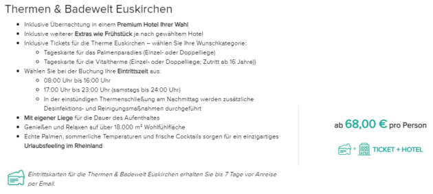 Thermen & Badewelt Euskirchen GmbH Thermenallee 1, Euskirchen Opening hours Vitaltherme und Sauna Wellness experiences in the Vitaltherme & Sauna Relax on one of our relax loungers under real South Sea palm trees or float in the crystalclear water of the Blue Lagoon Enjoy your time out and discover your wellness places provided to gain. Heute habe ich ein ganz besonderes Schnäppchen für die Therme & Badewelt Euskirchen bei Travelcircus gefunden!. Welcome Parkhotel Euskirchen Located 22 miles from Koln/Bonn airport, Welcome Parkhotel Euskirchen offers 24 hour front desk assistance, housekeeping service and wake up service as well as bikes for rent It contains 92 comfortable rooms that strike a perfect balance between comfort and style.