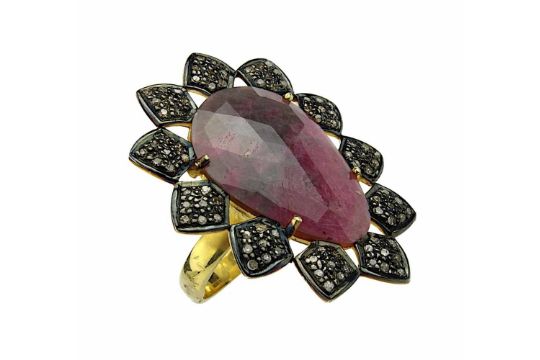 Silberner Rubin Diamant Ring 5er Silberne Ringschiene Vergoldet Ringkopf Mit 1 Grossen Tropfen