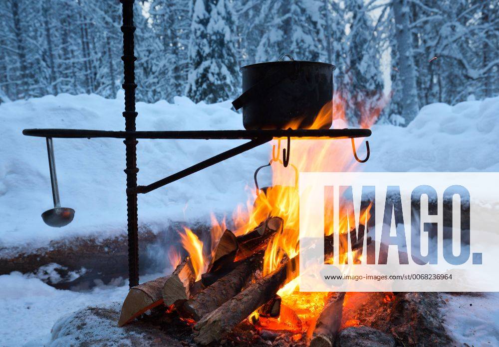 Touristischer Topf Der Im Winter Uber Dem Feuer Im Wald Hangt Und Uber Einem Lagerfeuer Kocht Lizenzfreie Fotos Bilder Und Stock Fotografie Image 5054
