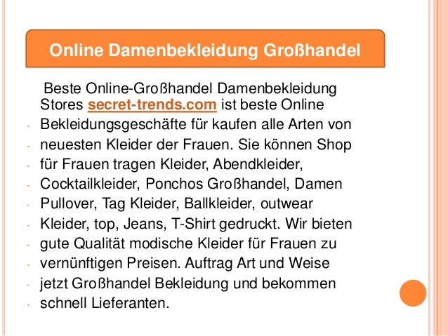 Damenbekleidung im Großhandel zum Wohlfühlen Ein wesentlicher Bestandteil jeder Damenbekleidung ist die Jeans, die als echter Allrounder in keinem Kleiderschrank fehlen darfDaher ist diese ganz besondere Hose nicht nur wesentliches Basic, die Jeans ist zugleich ein Lebensgefühl. Wenn Großhandel Kleidung, Schuhe, Taschen, Schmuck oder Accessoires Ihr Business ist und Sie auf diesem Marktplatz gelistet werden wollen und eine Plazierung auf wwwfashion123de (Plazierung im Mittenbereich) haben wollen und auf der internationalen (weltweiten) WebSite wwwfashionwholesalede mit gelistet werden wollen und. Damenbekleidung Revanche De La Femme Troianovski U Krebs Modedesingerin, Korsetts, Hochzeitskleid Versandhandel,Großhandel,Einzelhandel Die Erotex GmbH aus Nürnberg in Bayern ist der Fachmann für Versandhandel mit erotischer Kleidung Zudem schneidert Ihnen der bayerische Betrieb ein erotisches Korsett genau auf Ihren Leib Auch in.
