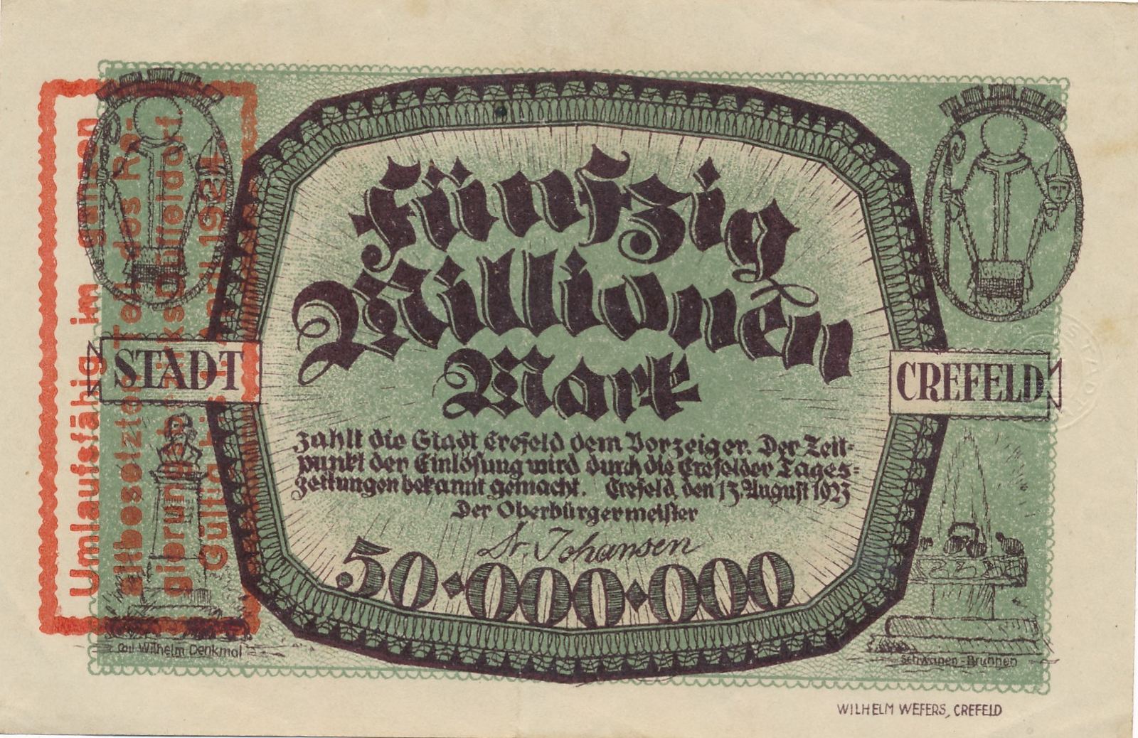 Deutschland 50 Millionen Mark 1923 Notgeldschein Notgeld Krefeld Crefeld Nordrhein Westfalen Rotes Stempel Iii Ma Shops
