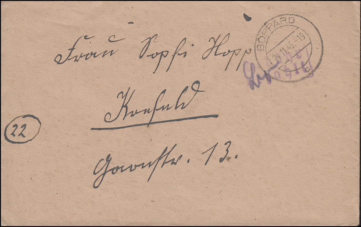 Gebuhr Bezahlt Stempel Auf Brief Boppard 24 11 1945 Nach Krefeld Marktplatz Philatelie