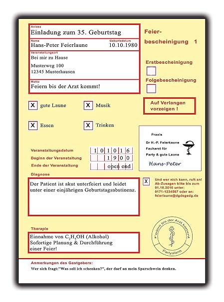 40 Bis 150 Einladungskarten Geburtstag Diverse Motive Zum Selber Bedrucken Professionelle Vorlagen Originell Witzig Individuell 40 Motiv Krankenschein Gelb Amazon De Burobedarf Schreibwaren