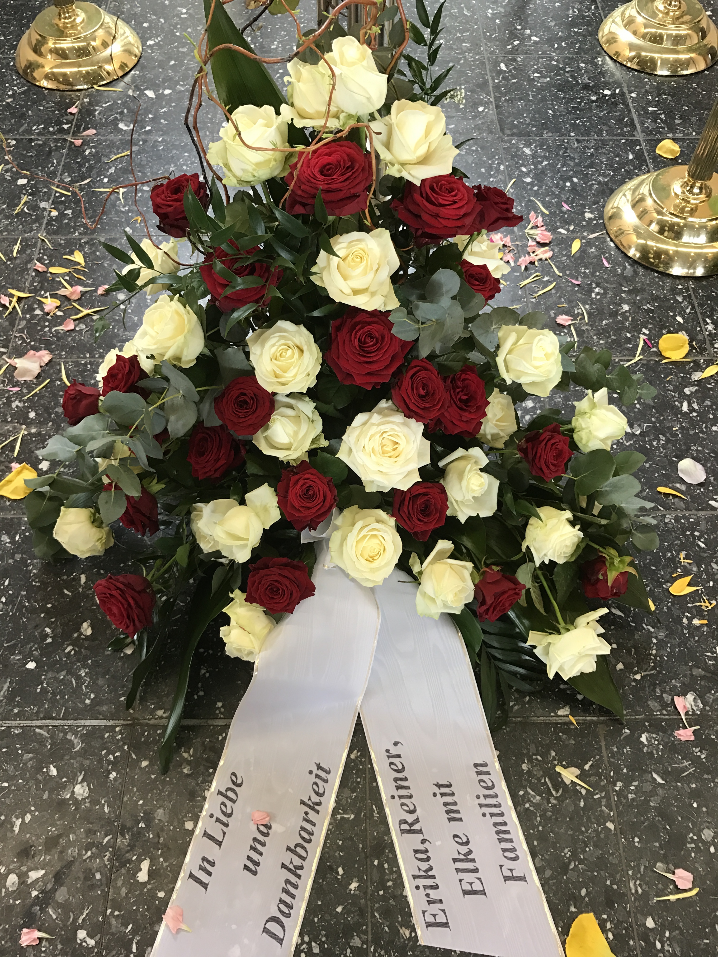 Blumengesteck zum Abschied mit roten Rosen,weißen Chrysanthemen und Schleierkraut zur Beerdigung #trauerfloristik #floristik #blumen #zumabschied #blumenfürdich #blumengesteck #ingedenken #abschied #trauer #beerdigung #trauerfeier #bestattung #gärtnereisinner #tübingen. Wir gestalten jedes Bukett (Bouquet), Blumengesteck, Trauerbukett, Trauergesteck, BlumenHerz und Herz aus Rosen nach Ihren Wünschen und zum besten Preis Trauerbukett mit Schleife und kostenloser Lieferung zum Friedhof in Wien Wählen Sie Art und Farbe der Blumen für das Gesteck, sowie die Farbe der Schleife und Ihren persönlichen Schleifentext. Nach Abschluss der Beerdigung wird der Kranz als frischer Grabschmuck auf das Grab gelegt Das Trauergesteck ist ein Blumenarrangement, das eine kompakte, zusammenhängende Form ausweist.