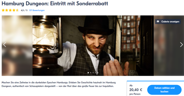 2 Hamburg Dungeon Tickets für 25,50€ statt 51€ Jetzt bestellen/hier klicken zum Angebot » Tretet ein ins Verlies von Hamburg und lasst euch im Hamburg Dungeon von tollen Shows und Attraktionen den Atem rauben – und das mit Rabatt 2x Hamburg Dungeon Tickets für zusammen 25,50€ statt 51€ (datumsgebunden) ab 12,50 € statt 25,50 € bei Radiogutscheine (Zahlung per Lastschrift). 2 für 1 Gutschein Informationen Hamburg Dungeon Gutschein 4 x 5 Euro Rabatt Informationen HolstenTherme Gutschein Prozent Rabatt Informationen Little Big City Berlin Gutschein 2 für 1 Gutschein Informationen Noctalis Gutschein 10 Prozent Rabatt Informationen Ostsee Therme Gutschein Bis zu 3 Euro Rabatt Informationen Rickmer. Ihr könnt euch schon jetzt mit einem der 2für1RabattGutscheine von nippon eindecken und euren Besuch flexibel planen, denn die Coupons sind bis 30 April nächsten Jahres.