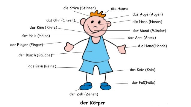 Wie heißen die Körperteile?. ID Language German School subject Deutsch als Fremdsprache (DaF) Grade/level Grade 5 Age 613 Main content Körperteile Other contents Der Körper Add to my workbooks (1) Download file pdf Embed in my website or blog Add to Google Classroom. Kleiner Tipp Die Nase ist rot Ach so, ein Clown.