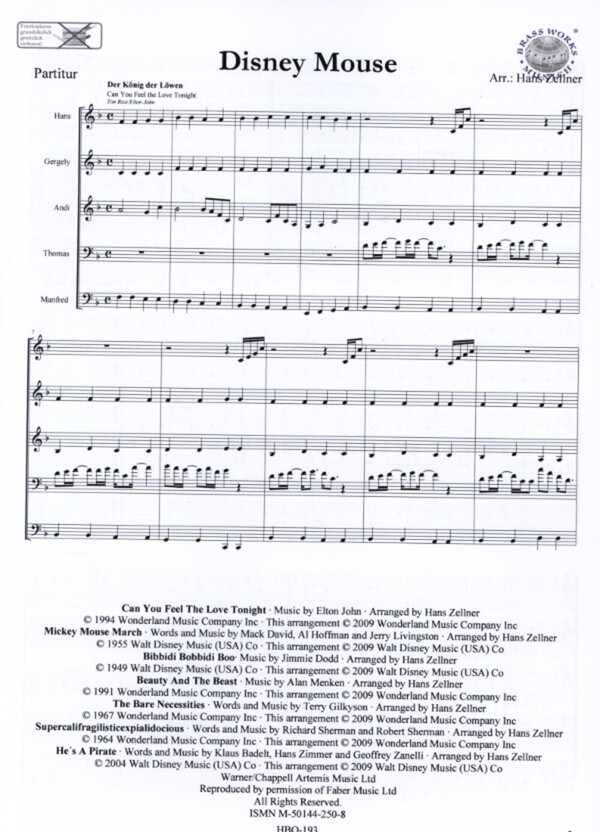 Zellner Hans Arr Disney Mouse Fur Brass Quintet Blechblasersortiment Kobl