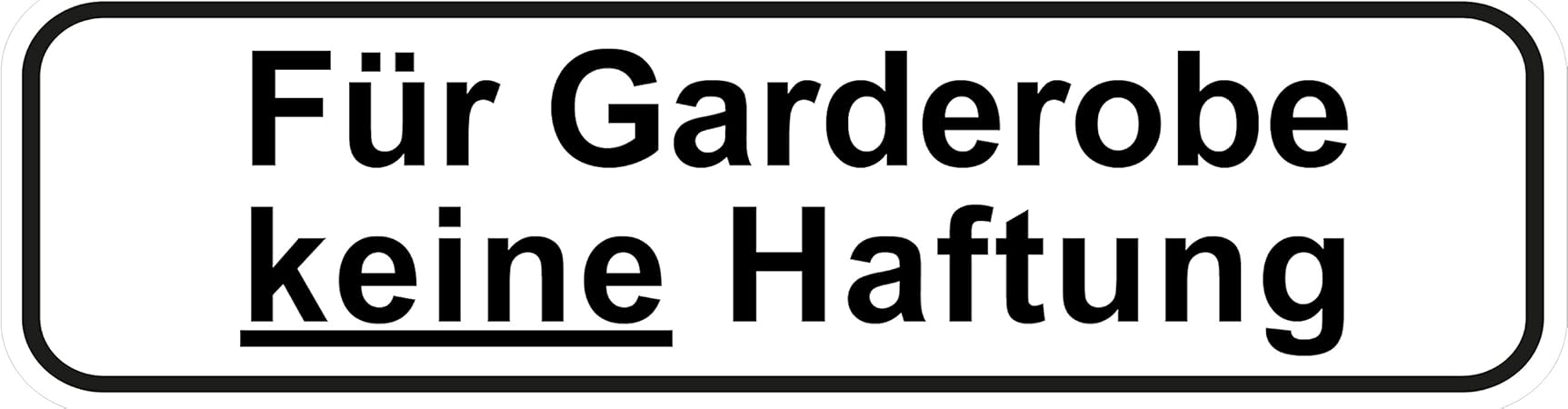 Metafranc Klebeschild "Für Garderobe keine Haftung" 0 x 48 mm / Beschilderung / Infoschild / Türschild. Ein Schild im Restaurant mit der Aufschrift „Für Garderobe keine Haftung" genügt nicht immer, um Schadenersatzansprüche von Gästen abzuwehren Bei unbewachten Garderoben verhält es sich komplizierter Nimmt der Gastwirt Sachen in Obhut, z B in einem separaten, durch den Gast nicht einsehbaren Raum, so haftet er meist im Schadenfall. Wie weiss ich nach, was für ne Jacke das nun war?.