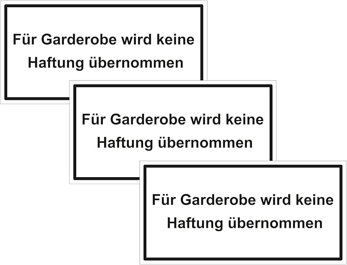 Kinekt3d Leitsysteme Schild/Türschild 160 x 40 x 1,5 mm Aluminium Vollmaterial eloxiert Oberfläche in geschliffener Edelstahloptik 100% Made in Germany (Für Garderobe keine Haftung) 100% Made in Germany. Der Gaderobe das übliche Schild "Für Garderobe keine Haftung" Ich muss aber 1 Euro entrichten und bekomme ein Zettelchen Was ist nun wenn a Die Jacke weg ist, weil der Typ in der Garderobe sie jemand flaschen gegeben hat?. Benötigte Programme Vorlage Schild, Garderobe keine Haftung (2 Seite/n) als PDFDatei aus der Kategorie 'Schilder' als SofortDownload kaufen, herunterladen und beliebig oft anwenden Zum Anzeigen und Ausdrucken wird der kostenlose Adobe Reader benötigt Tipps zum Beschriften und Drucken von PDFVorlagen.