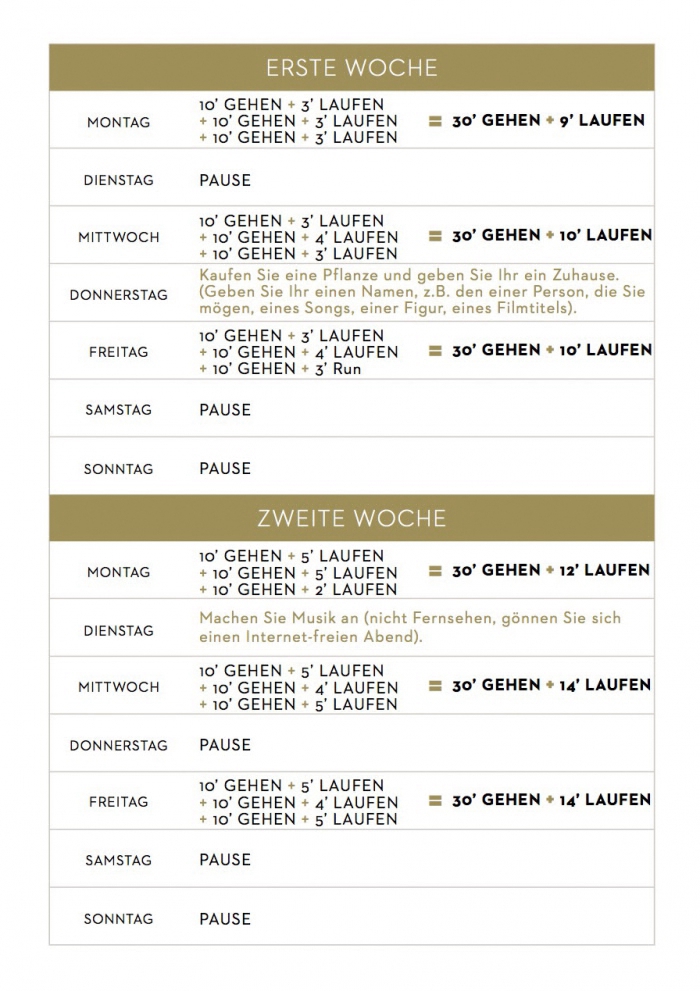 2 x 8 Minuten laufen im Wechsel mit 1 Minute gehen Optional 1 x pro Woche Krafttraining Woche 4 Montag 3 x 8 Minuten laufen im Wechsel mit 1 Minute gehen Mittwoch 1 x 10 Minuten laufen, dann 1 Minute gehen;. Dass Laufen mehr bedeutet als Bestzeiten und Kilos hinterherzurennen Denn Laufen kann und soll Spaß machen – und mit GET READY TO RUN, dem Buch für Laufanfänger, weisen wir Dir den Weg Wir wollen unser EBook GET READY TO RUN dieses Jahr endlich in den Druck bringen und dafür brauchen wir Deine Hilfe!. 32 min Steini;.