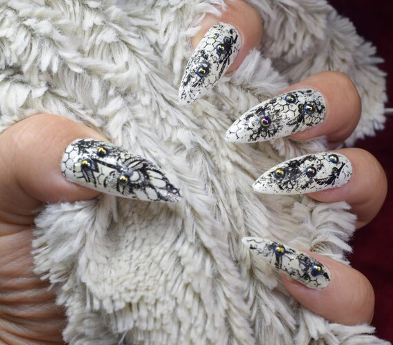 Weisse Schwarze Spitze Gefalschte Nagel Extra Lange Stiletto Etsy