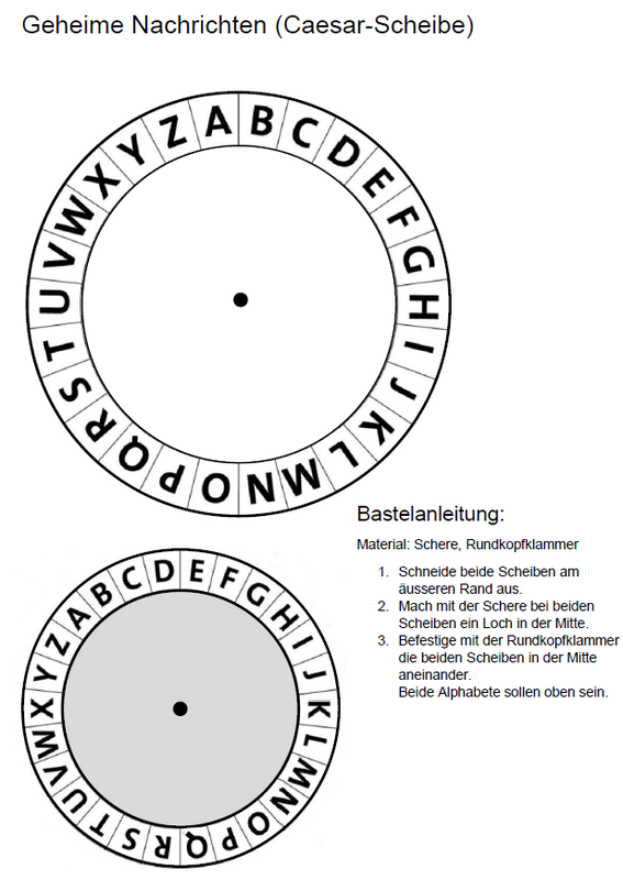 Druckt euch die ScheibenVorlage aus und klebe sie auf eine Stück Karton Schneidet dann die Kreise aus und befestigt sie mit einer Flügelklammer Und schon ist die CaesarScheibe fertig Und so funktioniert es Die Buchstaben auf der äußeren Scheibe stellen das “echte” Alphabet dar Mit der inneren Scheibe legt ihr euer Geheimalphabet. Schon der römische Kaiser Julius Cäsar (v Chr) soll folgendes Verfahren verwendet haben, um geheime Nachrichten an seine Feldherrn zu übermitteln Auch Liebesbriefe an Cleopatra soll er so verschlüsselt haben Cäsar ersetzte jeden Buchstaben seines Textes durch den Buchstaben, der im Alphabet drei Stellen danach kommt. Geheime Botschaften Die CaesarScheibe Bastelanleitung Drucke dir die beiden Scheiben aus und klebe sie auf eine dünne Pappe Schneide dann die Scheiben aus Lege die kleine Scheibe auf die große und befestige sie in der Mitte mit einer Musterklammer (das ist eine kleine Metallklammer, die man normalerweise zum.