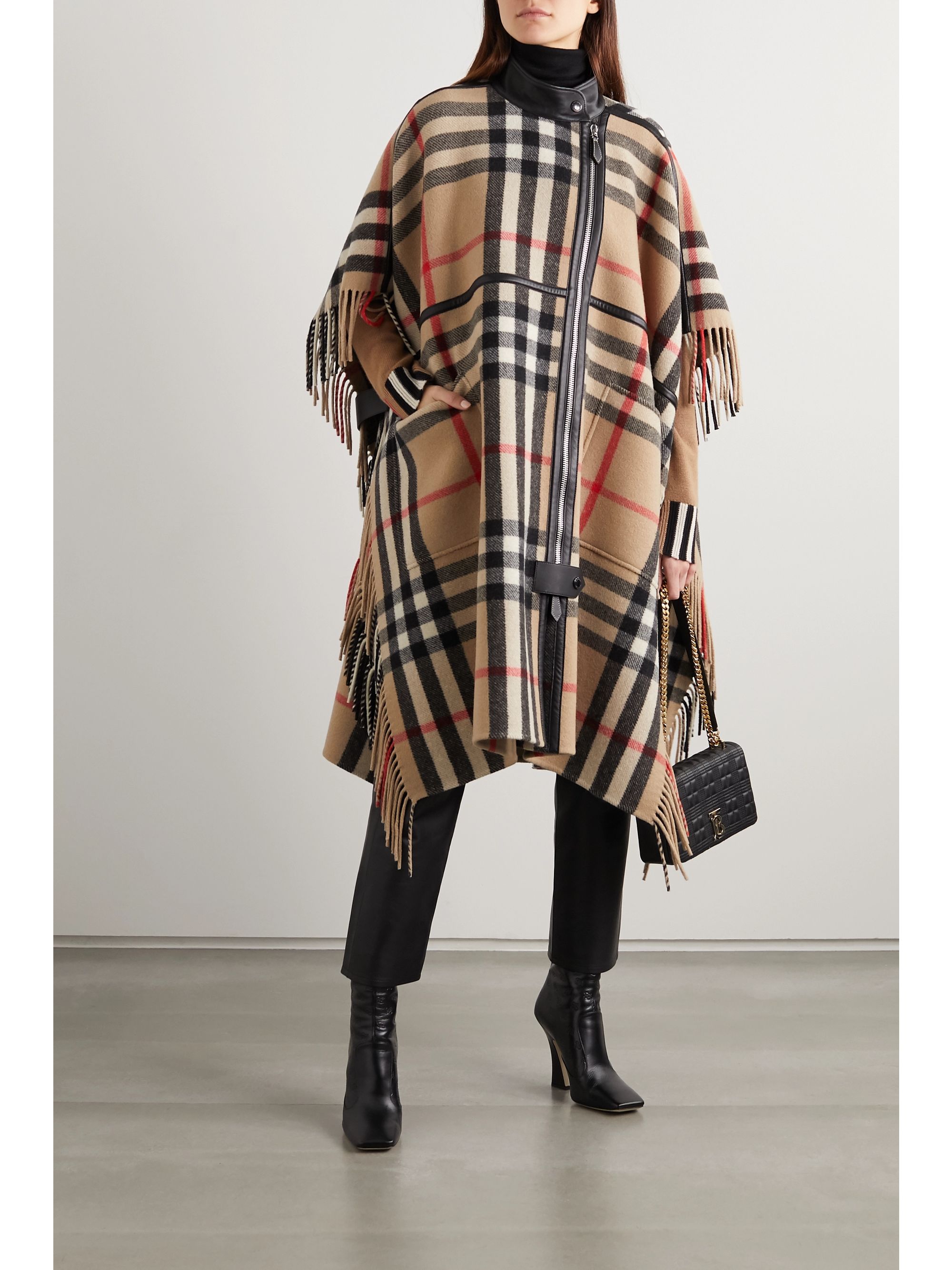 Beige Leather Trimmed Fringed Checked Wool Blend Cape Burberry Net A Porter
