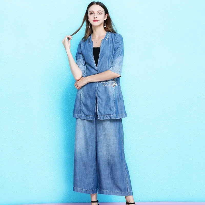 Casual 2 Piece Sets Loose Fit Denim Tops And Ankle Length Jeans Summer Elegant Wide Leg Denim Pants Blue Embroidery Outfit Women S Sets Aliexpress