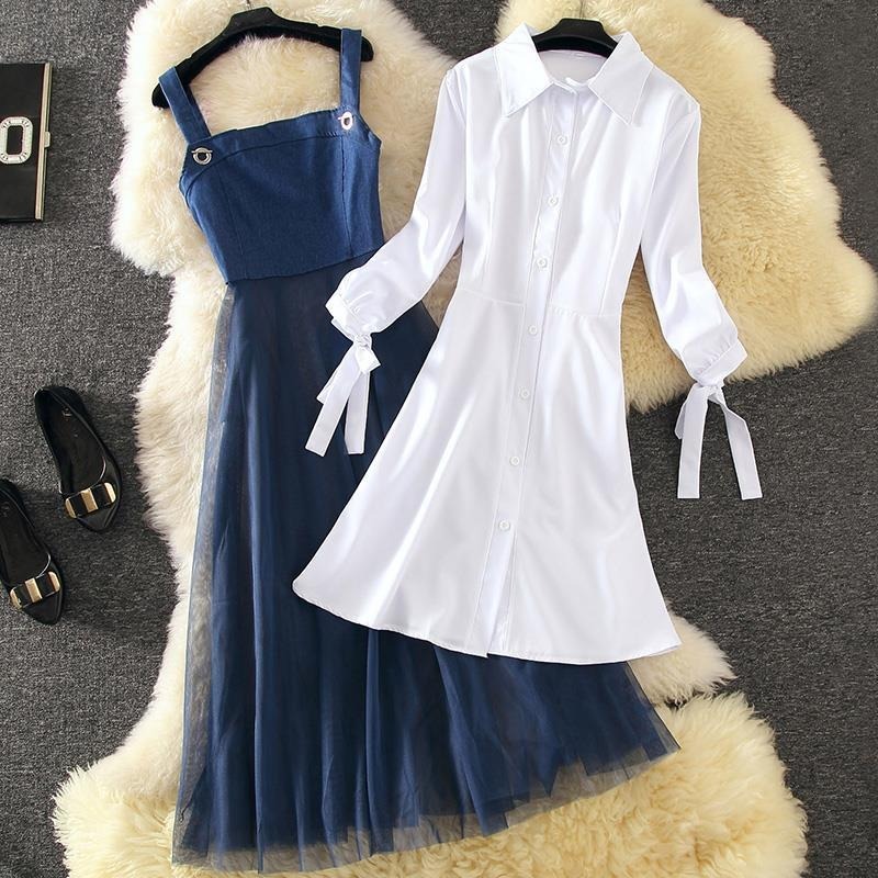 Women Elegant Two Piece Set Spring Autumn Long Sleeve White Blouse Dress And Spaghetti Strap Denim Outfit Ladies Korean Clothes Shopee Malaysia