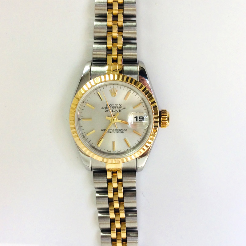 Get 5% in rewards with Club O!. Womens Rolex Datejust Silver Yellow Gold Fluted Bezel, 26MM Two Tone Jubilee, Rolex Box (1986). Rolex Datejust, Model Ladies automatic winding wristwatch Stainless steel case with 18k yellow gold fluted bezel (26mm diameter) Genuine Rolex silver diamond dial Stainless steel and 18k yellow gold Oyster bracelet Preowned with custom box.