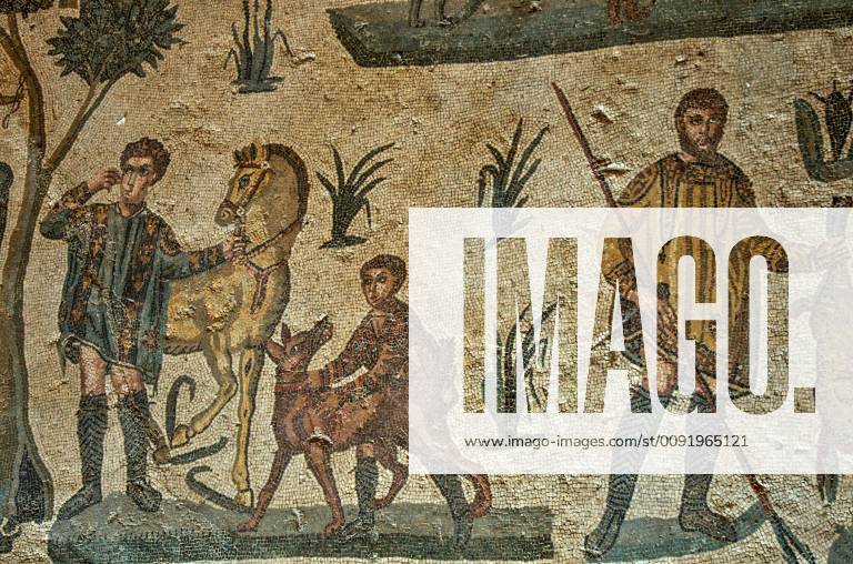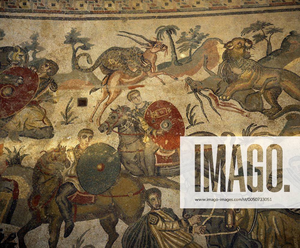 Italien Sizilien Piazza Armerina Villa Romana Del Casale Mosaik Mit Jagdszene Mit Lowen Stockfotografie Alamy