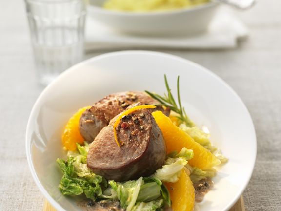 ChinakohlOrangenSalat ist ein Rezept mit frischen Zutaten aus der Kategorie frischer Salat Probieren Sie dieses und weitere Rezepte von EAT SMARTER!. Inzwischen den Chinakohl, Fenchel und Sellerie waschen, putzen und alles in feine Streifen schneiden Die Orangen gründlich schälen und die Filets herausschneiden Vom übrigen Fruchtfleisch den Saft ausdrücken Mit dem Öl, Essig, Mandelmus, Salz und Cayennepfeffer verrühren und abschmecken Den Feta klein würfeln Die Walnüsse hacken. Den Chinakohl waschen, in Streifen schneiden und in kochendem Salzwasser ca 2 Minuten blanchieren Abgießen und abtropfen lassen Auf einem vorgewärmten Teller etwas von der Sauce und dem Chinakohl verteilen, je 2 Medaillons darauf setzen und mit den Orangenfilets, ein paar Zesten und einem Rosmarinzweig garniert servieren.
