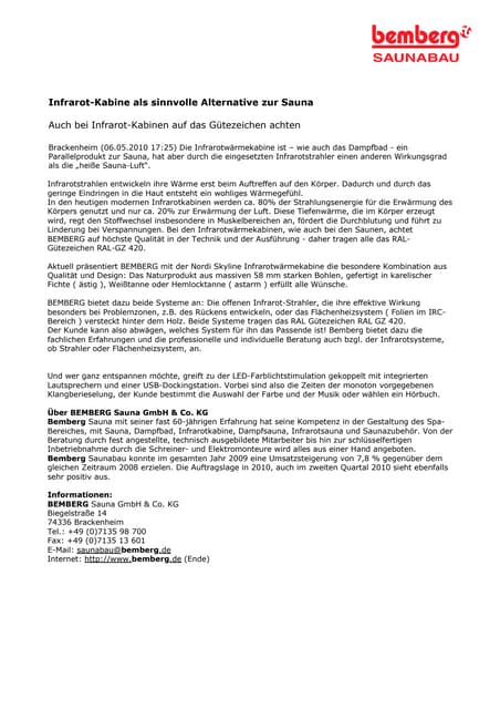 1 A sauna (10) comprising sauna heating (80) and benches (281, 2, 2) provided in different height positions for persons to sit and/or lie on, the whole bodies of these persons being within the sauna chamber (30), and having a heating device (80) which heats up the sauna air, and wherein the cooled air in the region of the floor (12) of the sauna chamber (30) is removed and is supplied. Mission Die Sauna macht Sie widerstandsfähig gegen viele Krankheiten und entspannt Körper, Geist und Seele Wir verarbeiten Naturmaterialien und bringen diese mit hohem. 41 Magazines from BEMBERG found on Yumpucom Read for FREE.