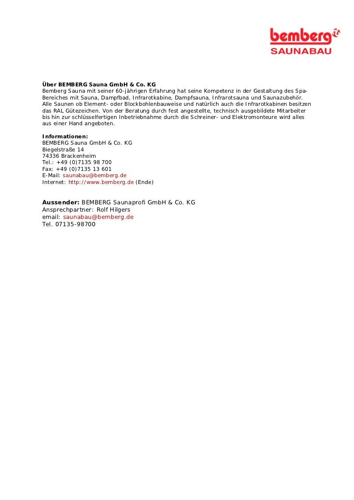 BEMBERG Sauna GmbH & CO KG Biegelstr 14 Brackenheim (0) Tischlereien Brackenheim wwwbembergde Mehr Infos Mehr Infos (0) Lorenz GmbH Gassentor 33 Brackenheim Dürrenzimmern (0) Tischlereien Brackenheim schreinereilorenzgmbhde. Edukacija, obuka i organizacija;. Paul Bemberg Sauna GmbH & Co KG Land Deutschland PLZ Ort Brackenheim Strasse Hausnr Biegelstraße 14 Telefon (0) Fax (0)7135 – EMail saunabau@bembergde.