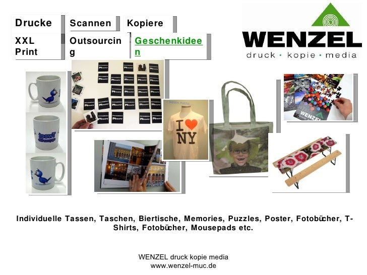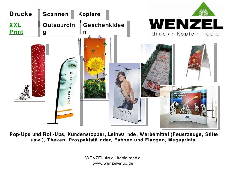 Zur WENZEL Gruppe gehören neben der WENZEL GmbH (4x in München) auch die beiden Tochterunternehmen Hansa Print Service (München) und die Kopierzentrum Passau GmbH mit ihren Mitgliedern Digitalcenter, XLPRINT24 und textil & druck Seit seiner Gründung bietet das. Wenzel druck • kopie • media, München Gefällt 349 Mal WENZEL druck • kopie • media ist spezialisiert auf die Dienstleistungen Drucken, Scannen, Kopieren Mehr unter wwwwenzelmucde,. Plotten bzw Großformatdruck ist ein Schwerpunkt bei WENZEL aus München Wir plotten Ihnen Ihre PlotDateien/CAD oder Pläne dateigetreu und in bestmöglicher Qualität aus, auf Papier (80g bis 160g), Transparentpapier oder Folien, bis 600 dpi Auflösung.