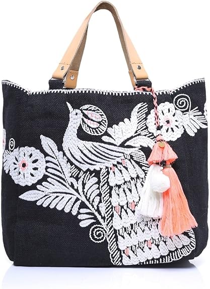 STAR MELA Handbags medium, detachable application, embroidered detailing, double handle, fully lined, solid color, shopping bag 100% Jute. Safe shipping and easy returns. May 31, 17 Star Mela Pinki Embroidered Tote Large tote Jute Double flat top handles Embroidery throughout Hanging tassel accents Fabric interior lining with one flat pocket Open top Measurements Body length 18, height 14, width 4, drop handle 7 Material Shell 100% jute;.