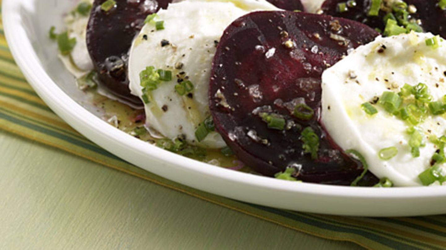 RoteBeteMozzarella Rote Beten, Büffelmozzarella, Schnittlauch, Olivenöl, BioZitronenschale, Zitronensaft, Zucker, Meersalz, schwarzer Pfeffer. Wie immer gilt den Saft kauen!. Probieren Sie unsere 10 besten Rezepte mit Rote Bete.