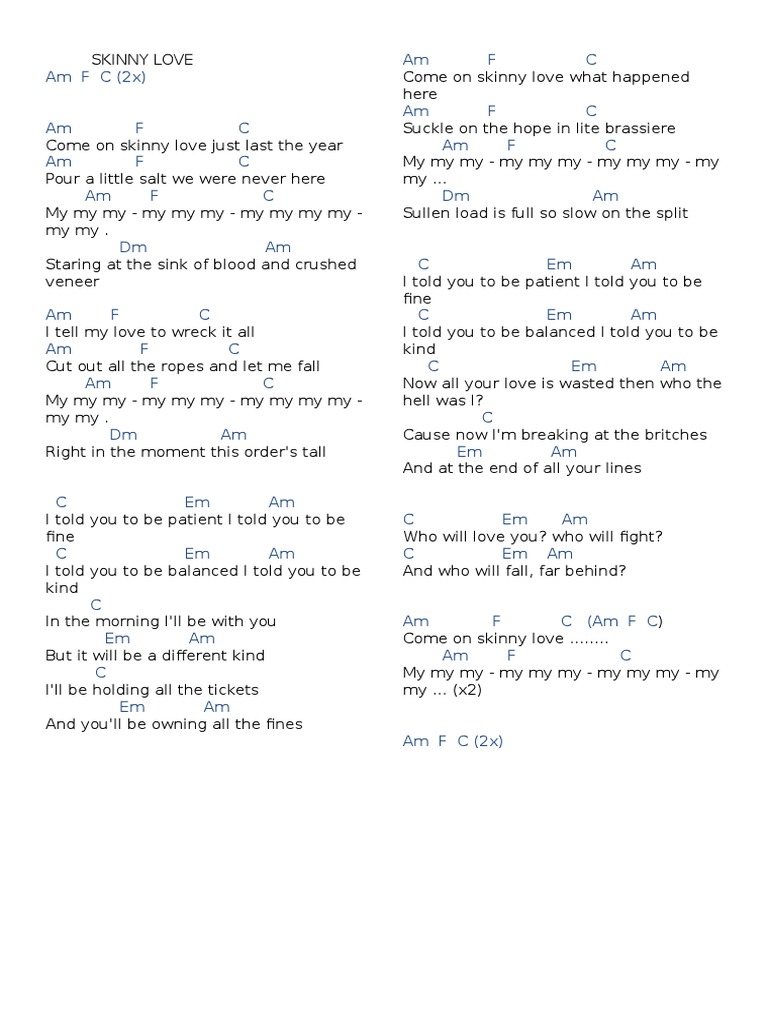 Intro C#m A E x2 Verse C#m A E Come on skinny love just last the year C#m A E Pour a little salt we were never here C#m A E My my my my my my my my my my my my F#m C#m Staring at the. Intro Am F C Am F C Verse 1 Am F C Come on skinny love, just last the year Am F C Pour a little salt, we were never here Am F C My my my my my my my my my my my my Dm Am Starin. CAPO 4 Intro Am, F, C (2x) Verse Am F C Come on skinny love just last the year Am F C Pour a little salt we were never here Am F C My my my – my my my – my my my my – my my F Dm Am Staring.