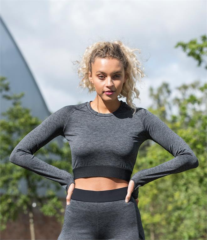 Sport Gym Crop Top Shirt Langarm Bauchfrei Gr Xs Xl Schwarz Grau Meliert Jc039 Ebay