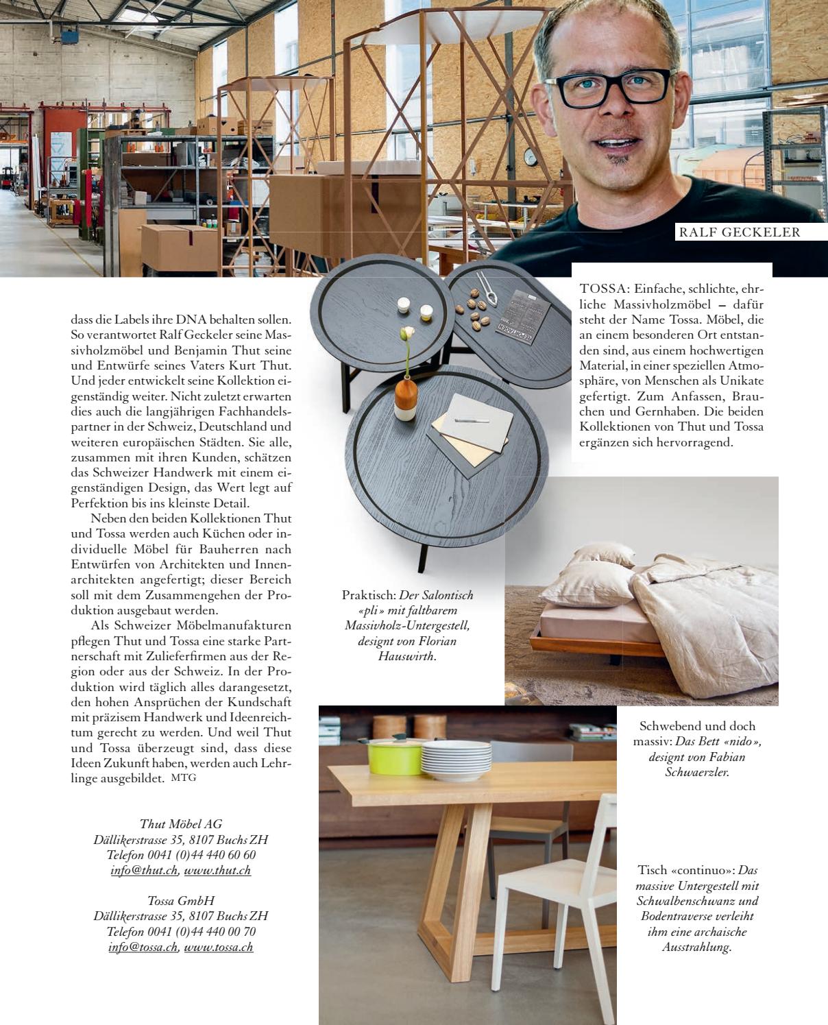 Anschrift Thut Möbel AG Dällikerstrasse 35 8107 Buchs ZH Schweiz 41 44 440 60 60 info@thutch Vertretungsberechtigte Person Benjamin Thut, Mitglied des Verwaltungsrates. Die Fabrik 1, Schweizer Möbelmanufaktur von Thut Möbel und Tossa, fertigt neben den beiden Kollektionen auch Küchen oder individuelle Möbel an Dällikerstrasse 35 8107 Buchs 41 44 846 50 50 info@fabrik1ch Montag bis Freitag 0800 10 1400 1700 Thut Möbel AG.