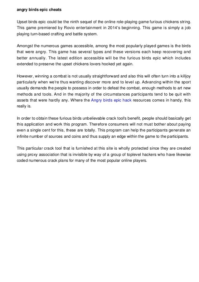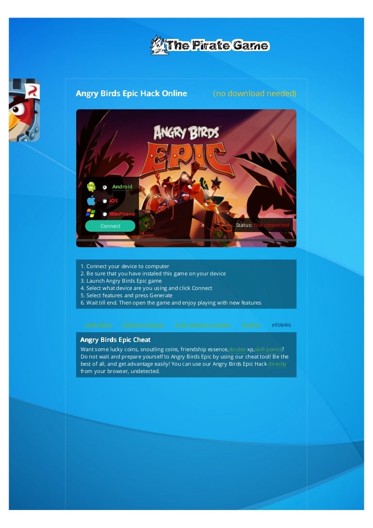 Angry birds epic hack Cheats Tools Features Add Unlimited lucky coins;. Submit the required information and click ‘generate’ Click ‘verify’ to activate the cheat. No Ads – Wph9wvh06d.